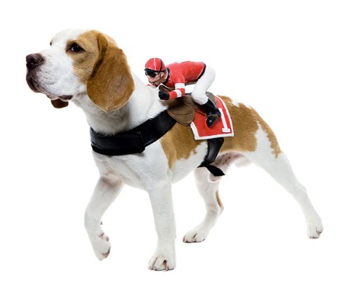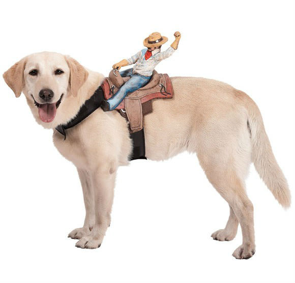 The dog riders pet costumes are a hilarious addition to any dog’s wardrobe. They currently come in Jockey, Rodeo, and Headless Horseman models.