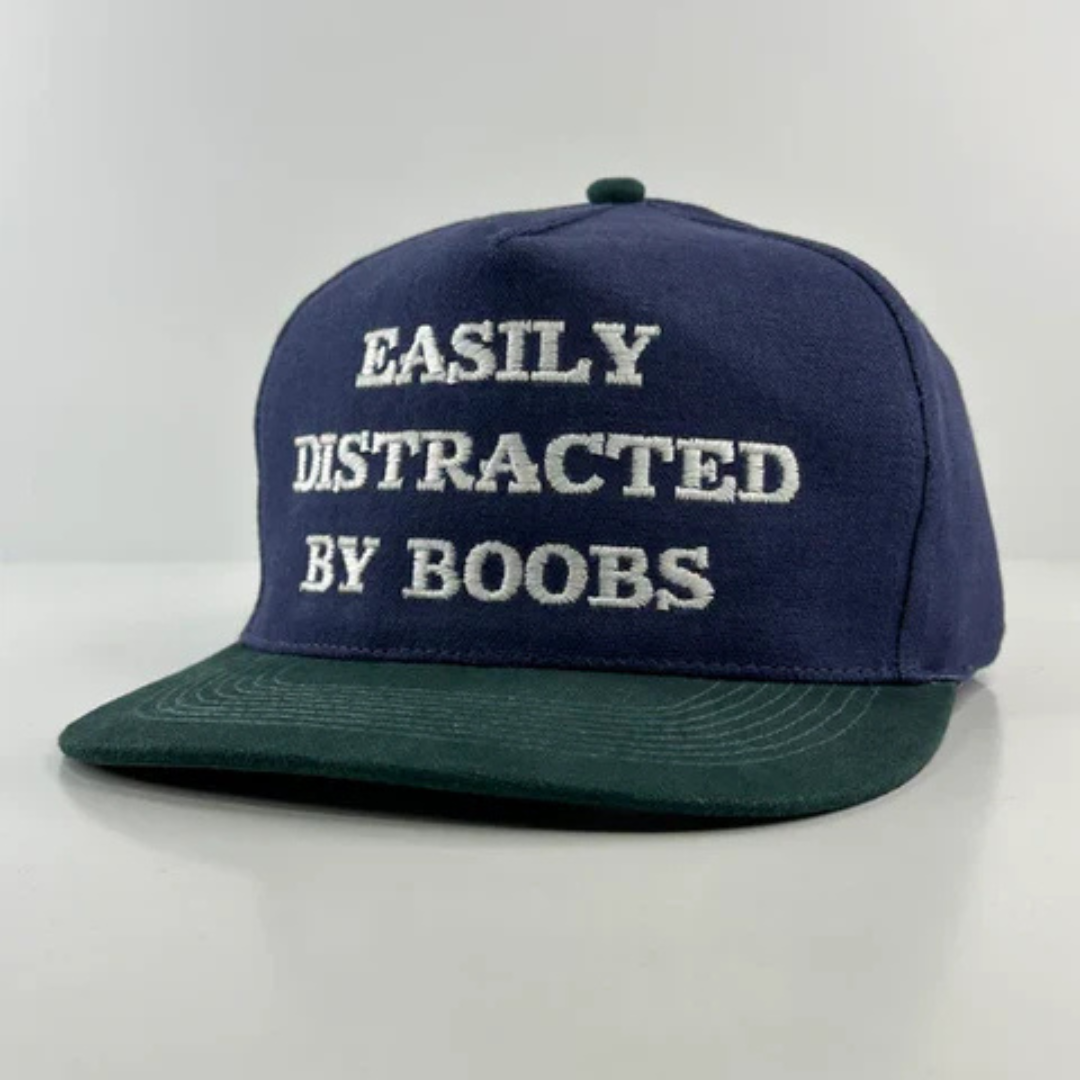 There are hats that whisper, hats that hint… and then there’s this absolute menace of a cap that walks into the room, kicks over a chair, and announces itself like it owns the lease. “EASILY DISTRACTED BY BOOBS” isn’t just embroidery—it’s a lifestyle disclaimer. You’re not here to pretend you’re focused, organized, or even remotely subtle. You’re here to be honest, chaotic, and maybe slightly banned from family group chats. This hat doesn’t accessorize your outfit—it becomes the main character.