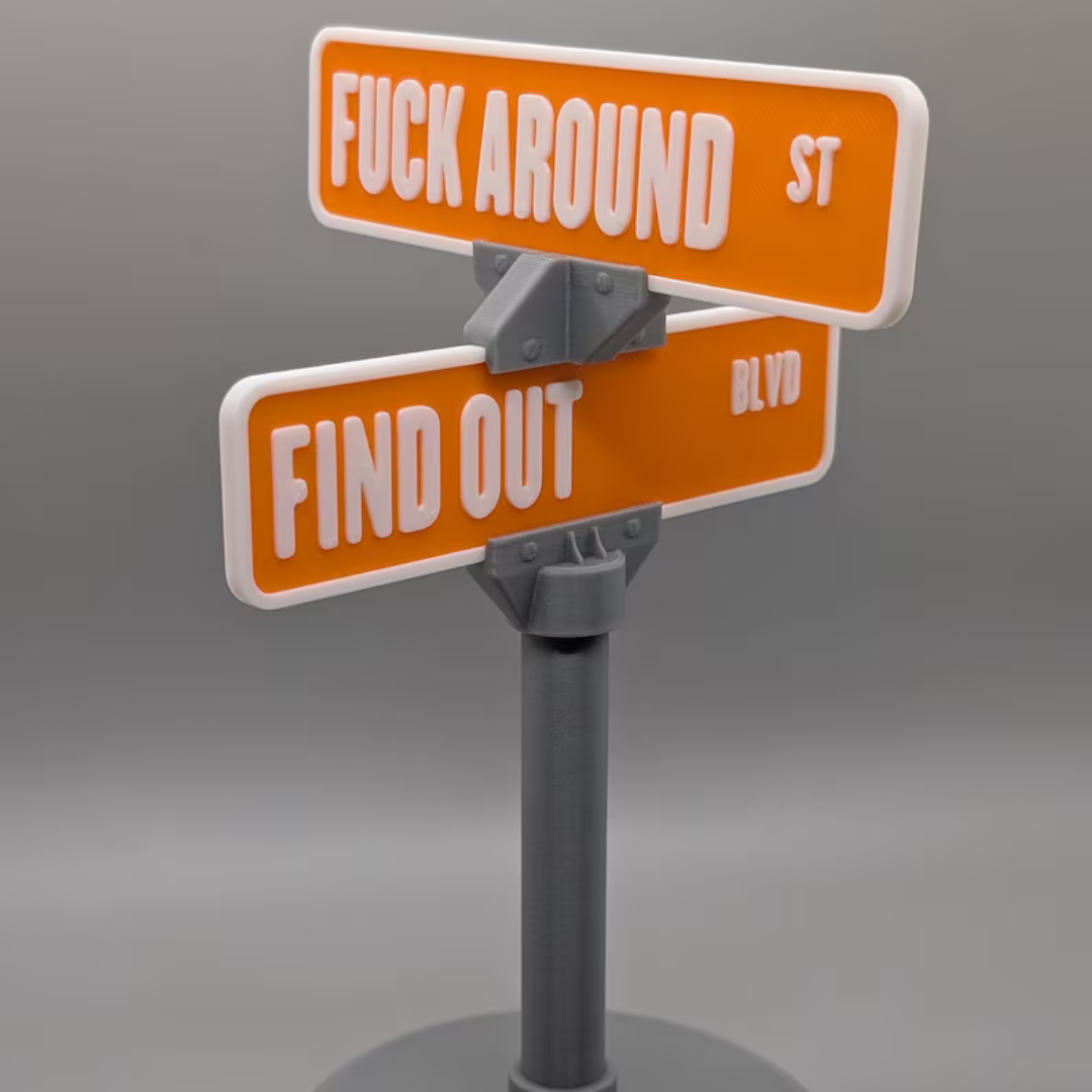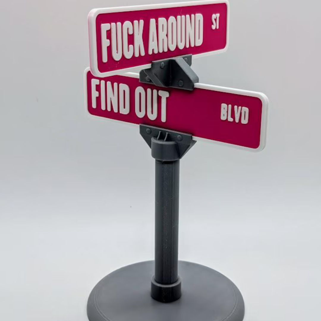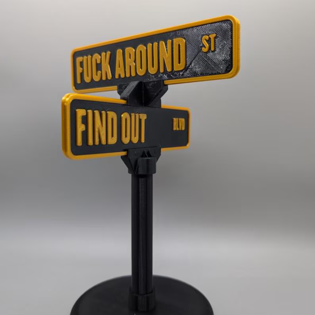 Let me introduce the crown jewel of workplace decor: the “Fuck Around And Find Out” Desk Stand. Not just a motivational sign, it’s a spiritual boundary. It sits quietly, gleaming with chaotic neutrality, warning Karen from Accounting that today is not the day. It doesn’t blink. It doesn’t flinch. It merely radiates the energy of someone who once emailed HR and cc’d Satan.