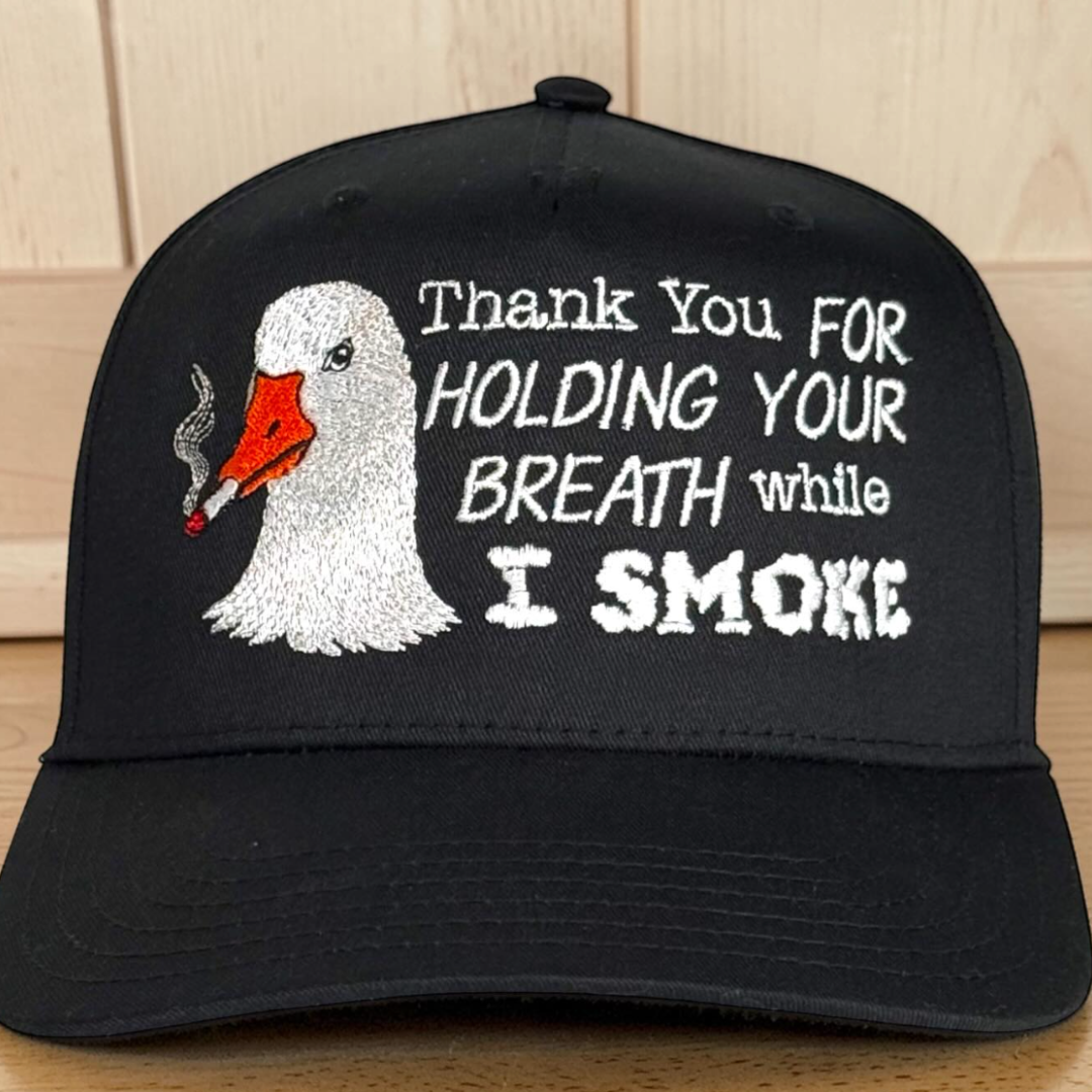 Wear it to the bar, the gas station, family BBQs, or anywhere you’d like strangers to laugh, stare, and wonder if you’re either the funniest person they’ve met all week or the start of a minor neighborhood legend. The embroidered goose calmly puffing away next to the phrase “Thank You For Holding Your Breath While I Smoke” creates the perfect mix of absurd confidence and chaotic energy. It’s the kind of hat that makes people say, “I shouldn’t like this… but I absolutely do.” Honestly, if the goose can live his truth, so can you.